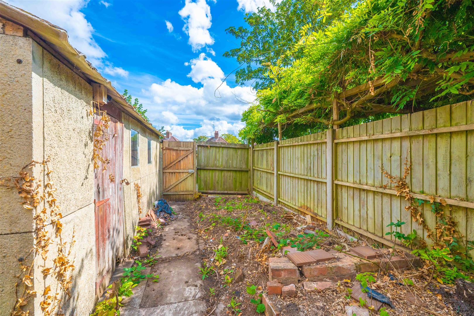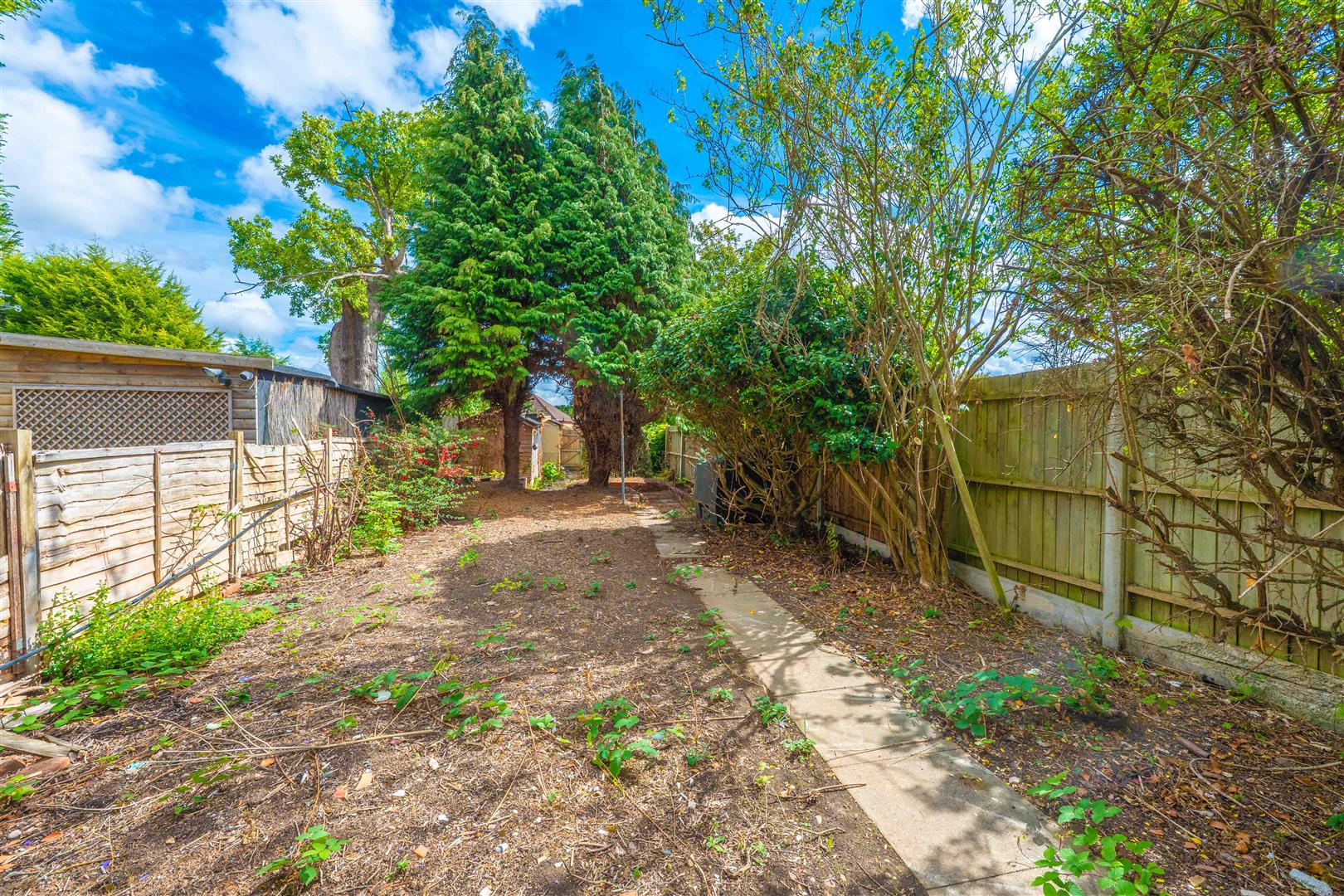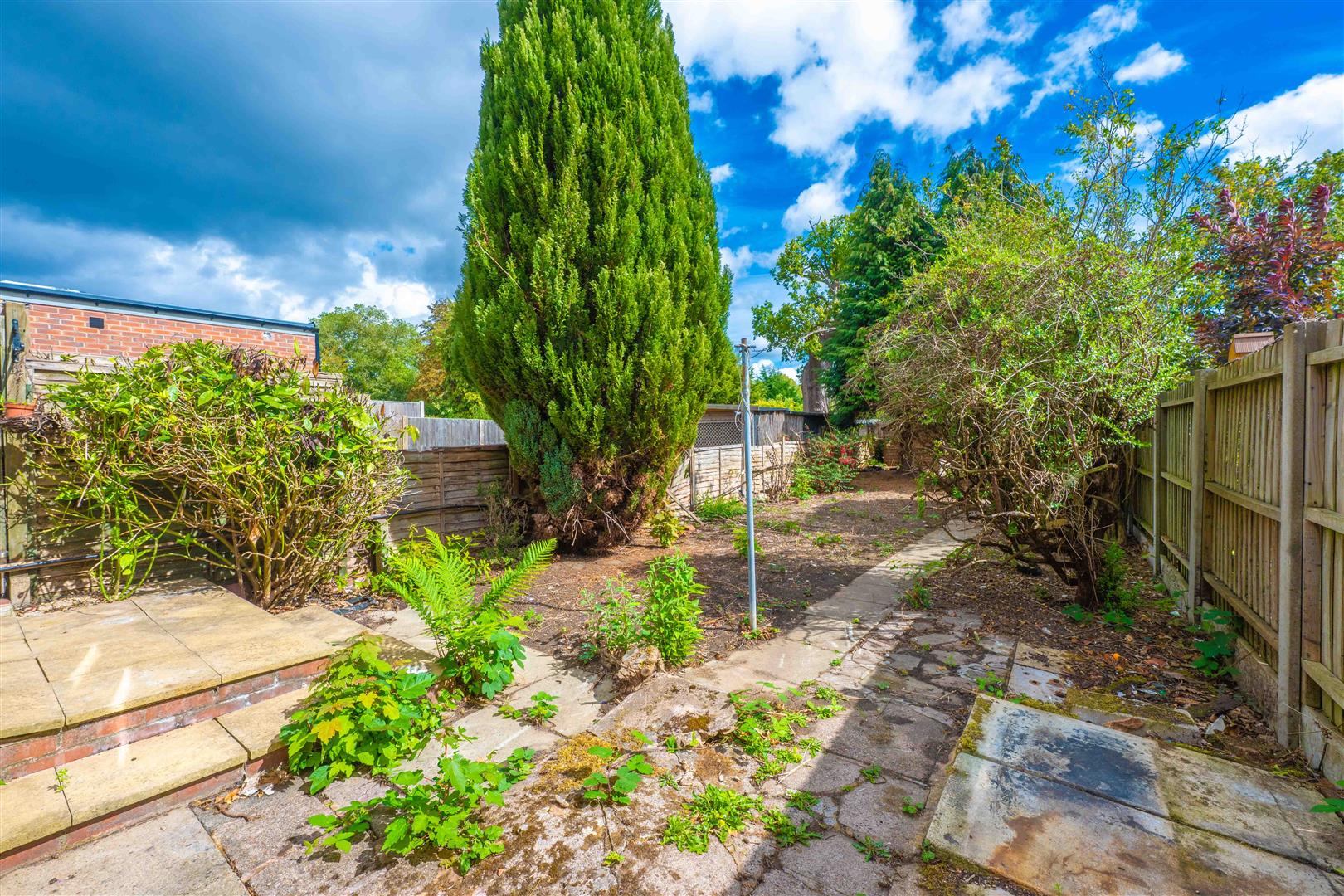 Long rear garden with paved patio area, mature trees and bound on three sides with timber fencing. At the rear of the garden, there is a concrete sectional garage and timber gate that leads to the pedestrian and vehicular access.