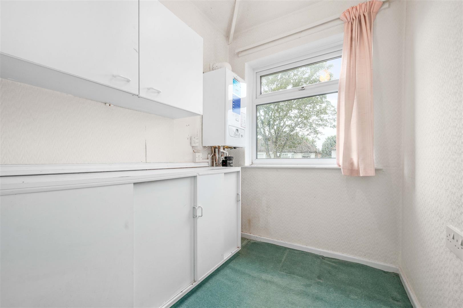 Housing the gas fired central heating and hot water boiler; with glazed window to the front, fitted wall and base storage units, and radiator.