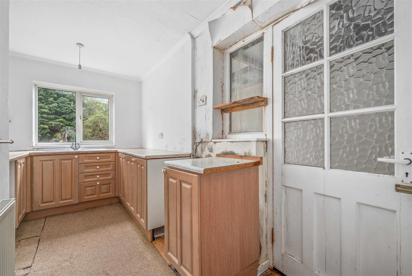With glazed window to the rear, a range of drawer and base units with work surfaces over, inset stainless steel sink with swing mixer tap over, space for a freestanding cooker, space for undercounter refrigerator, and radiator. Glazed door (with matching screen to the side) into: