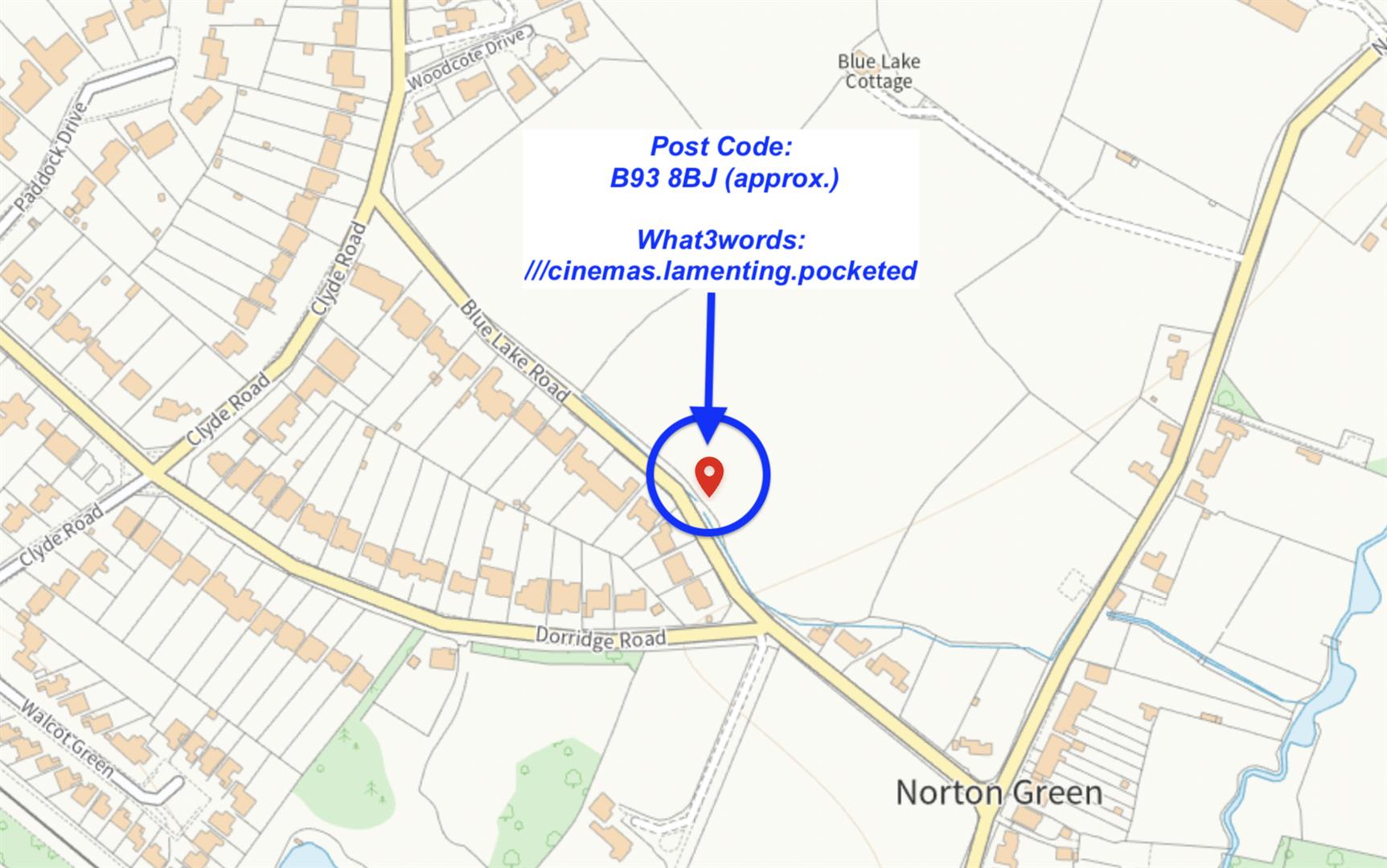 From Stratford upon Avon, the A3400, Redditch and the west, at Hockley Heath take the B4101 signposted to Dorridge and Knowle. Just under the railway bridge in Dorridge, turn right into Station Approach, and then take Dorridge Road to the end, where it merges with Blue Lake Road. Turn left into the latter, where the sale field will be found on the right hand side.
