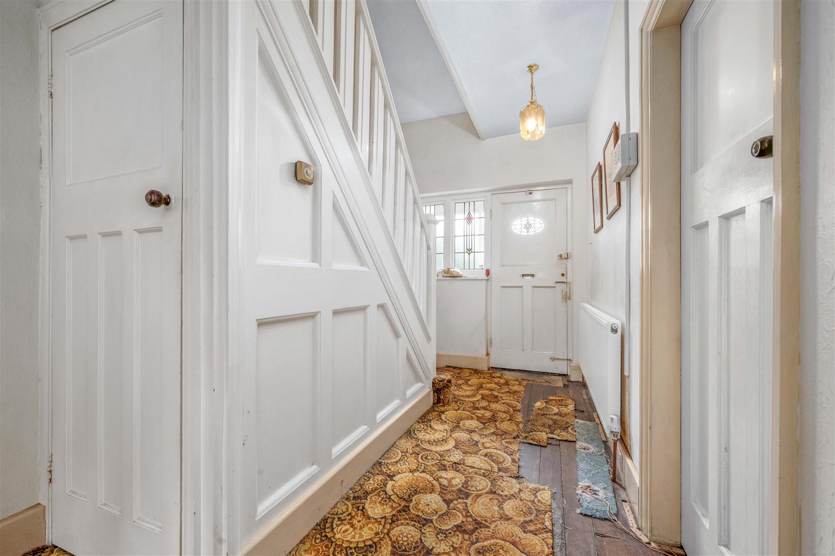 With feature leaded light stained glass window to the front, staircase rising to the first floor, door to understairs storage cupboard, and radiator. Door into: