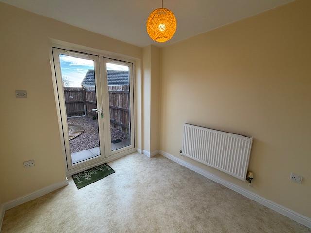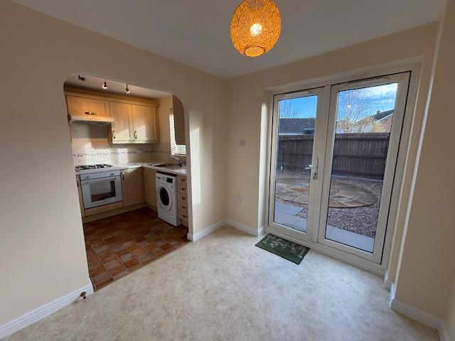 The accommodation comprises hallway, lounge, downstairs WC, dining area, and kitchen with double doors opening onto a secure rear garden with side access to the garage.