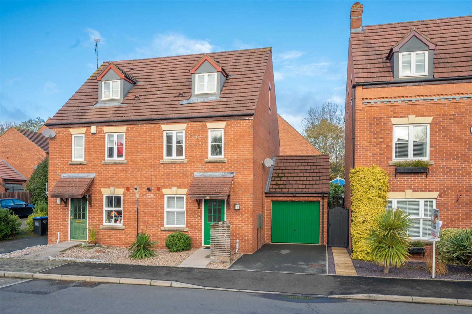 An attractive three-bedroomed semi detached family home located within a quiet Cul-De-Sac on the popular Warwick Gates development, just south of Leamington Spa. Arranged over three floors, the property benefits from being within walking distance of local amenities, parks and schools. Briefly comprising:- Spacious entrance hall, fitted kitchen, understairs utility room (formally a W.C) and living room with patio doors leading to garden to the ground floor. To the first floor, one double bedroom, further single bedroom and family bathroom. To the second floor, master bedroom and large en-suite shower room. To the front is driveway parking and garage. There is a private rear courtyard garden with access to the rear of the garage.